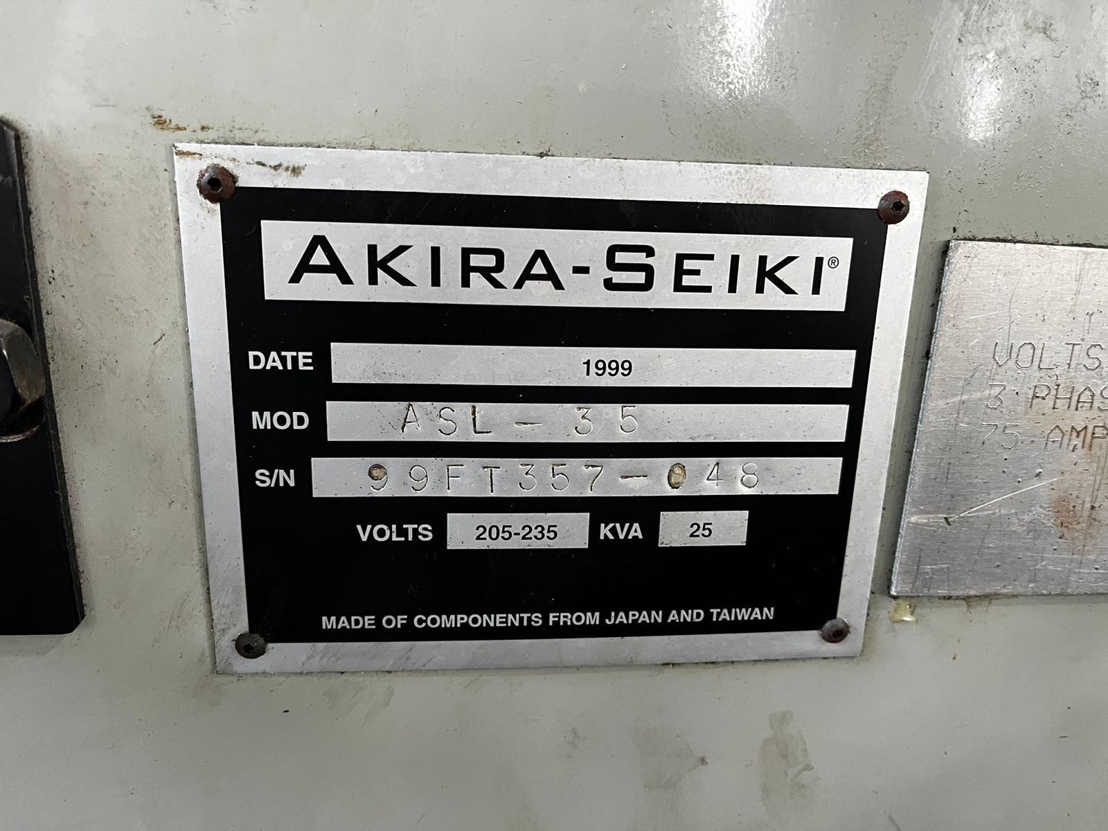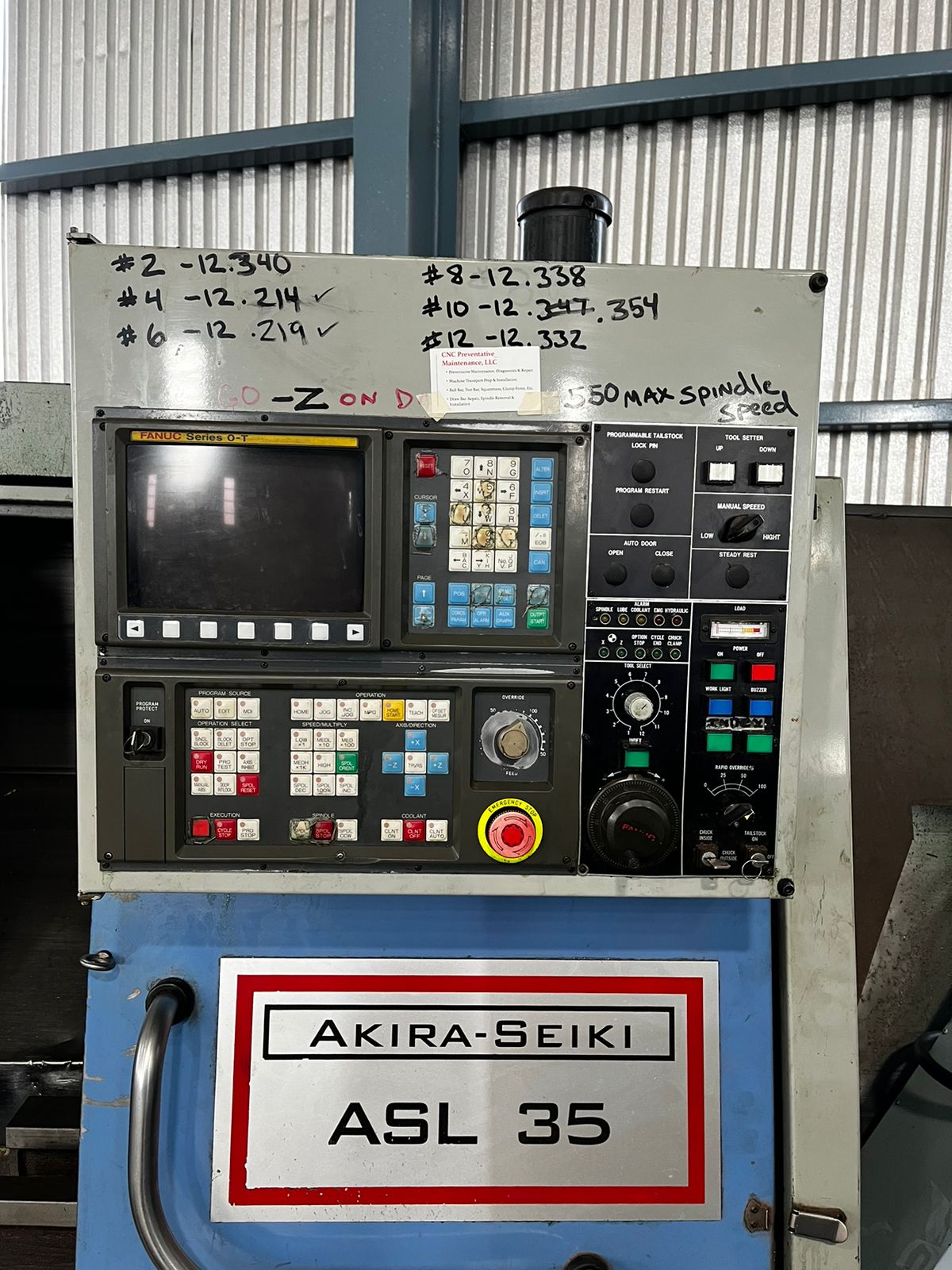 Brand AKIRA SEIKI 1999 Model ASL 35 Type CNC Lathes ChuckSize 10 inch BarCapacity 75MM Axis 2 Power 25 hp MaxRPM 4000 rpm TurningDia 400MM Swing 600MM MachiningLength 600MM Tailstock Yes Control CNC (Fanuc O-T)